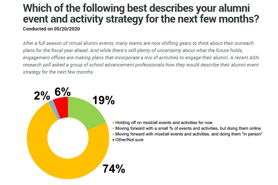 While Alumni Relations teams may be embracing the shift to virtual events, most of these institutions are apprehensive about going fully virtual while planning their events calendar for this year. Some feel that virtual events can never substitute the feeling that alumni share at in-person events and also are apprehensive about security concerns such as Zoom bombing. However, this new world order is gradually prompting many teams to think differently and explore all options.