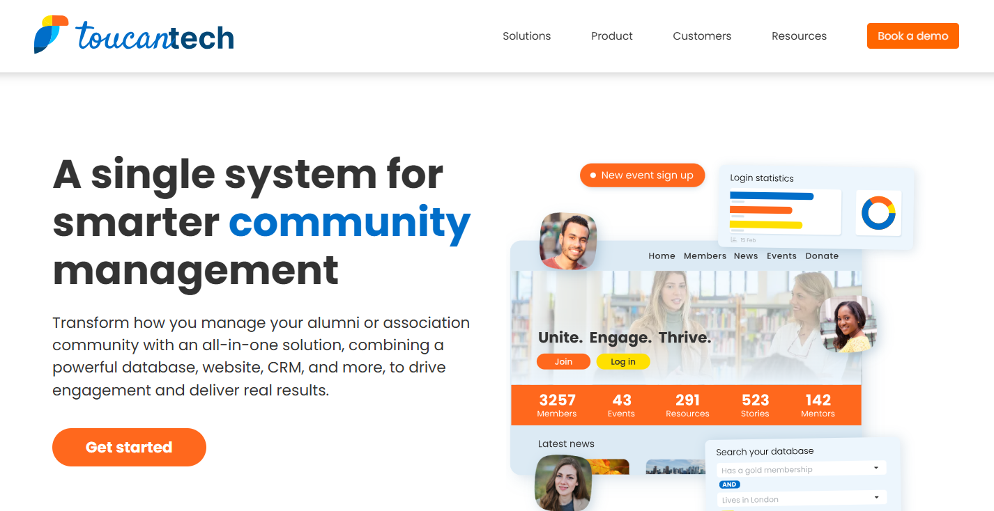 ToucanTech is a community and alumni management platform that combines CRM-style data management with engagement tools. It aims to help institutions centralize alumni records, communications, and activities within a single system that supports segmentation, outreach, and relationship tracking.
