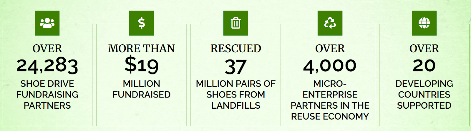 Funds2Orgs runs a Shoe Drive fundraising program where schools, nonprofits, and community groups collect gently worn, used, and new shoes from their networks and get paid by weight. Funds2Orgs handles the pickup and logistics.