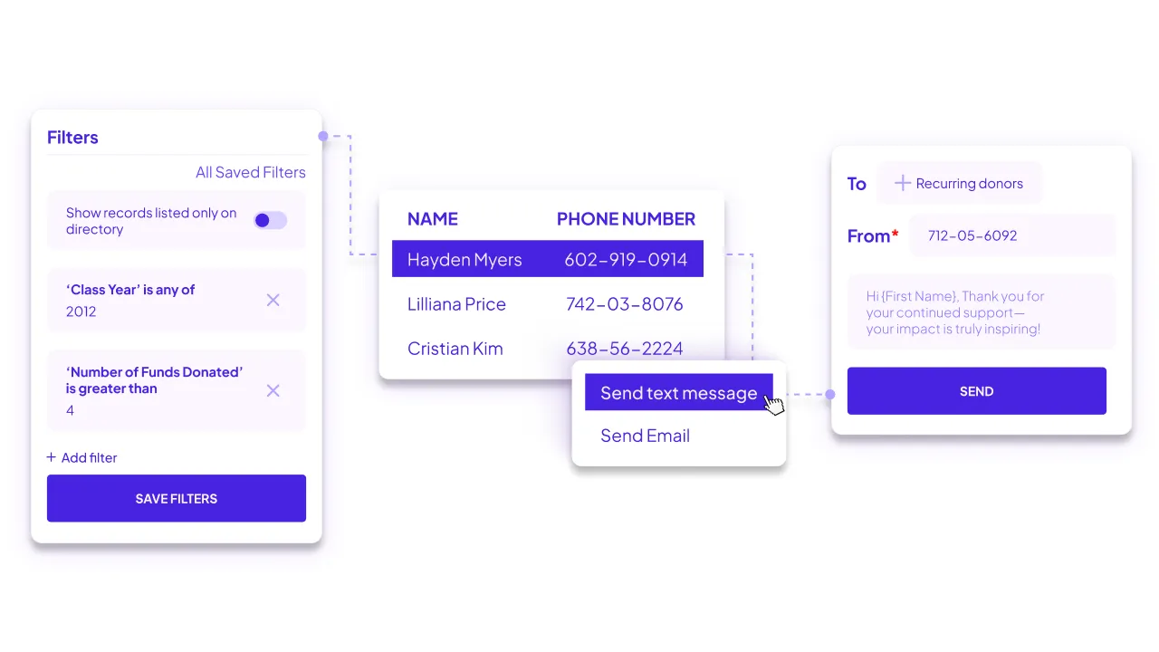Whether you're running a campaign, planning an event, or sharing general updates, text messaging on Almabase fits right into the way you already work: