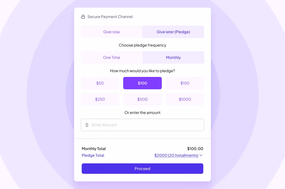 Introducing Pledge for Later. Let donors commit to future gifts on your checkout page, even when they can't pay today. Automate tracking, reduce follow-ups, and never lose a warm lead. Learn more