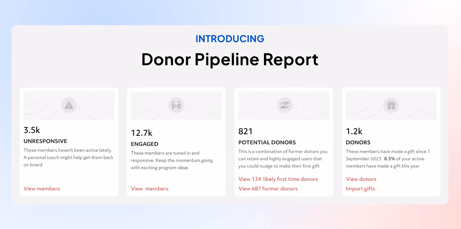 That's why we're thrilled to introduce the new Donor Pipeline Report. It’s specifically designed to take the guesswork out of engagement by providing a clear, actionable breakdown of your community. With this report, visualizing your donor funnel becomes straightforward, enabling you to take smarter, more targeted actions- without the need for complex marketing techniques.