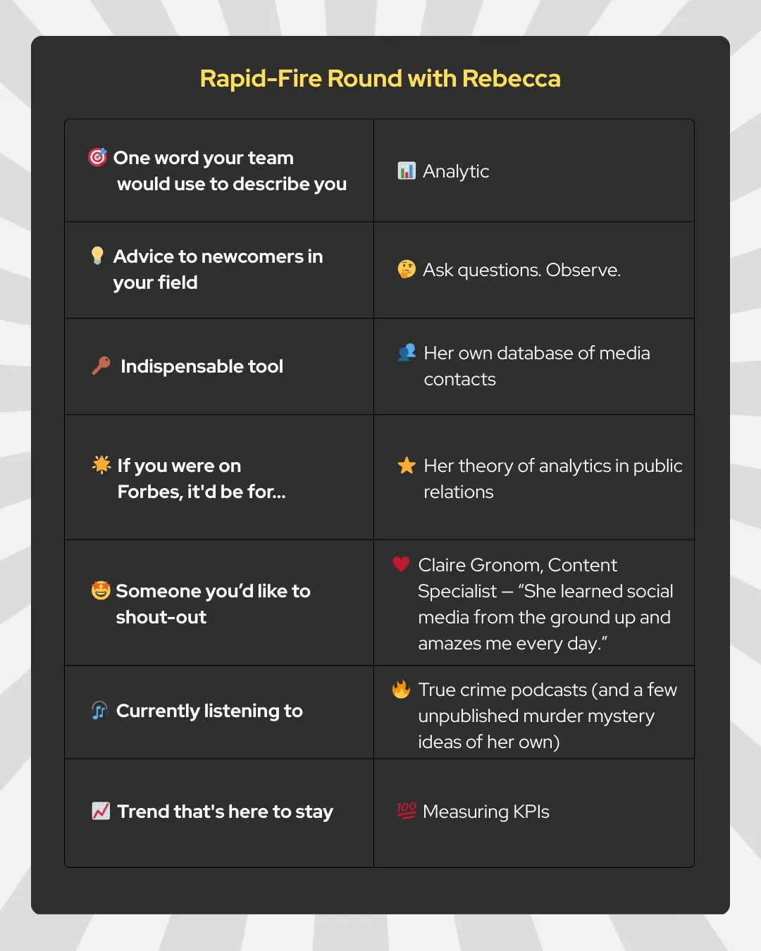 Rebecca’s goal is to build on Lane’s new era of data-driven communications using audience insights, story mining, and refined KPIs to craft messaging that actually lands.