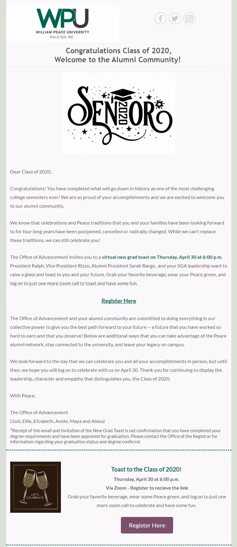 As the Class of 2020 missed their traditional end-of-year programming and are already preoccupied with thoughts of an uncertain future, William Peace University’s advancement team knew that they had to do something truly special for their newest community members.