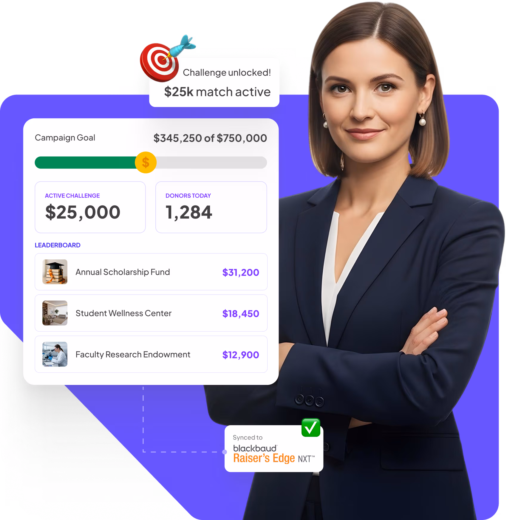 Create urgency & momentum donors can't ignore, with live leaderboards, challenge milestones, and real-time thermometers - all updated on their own.