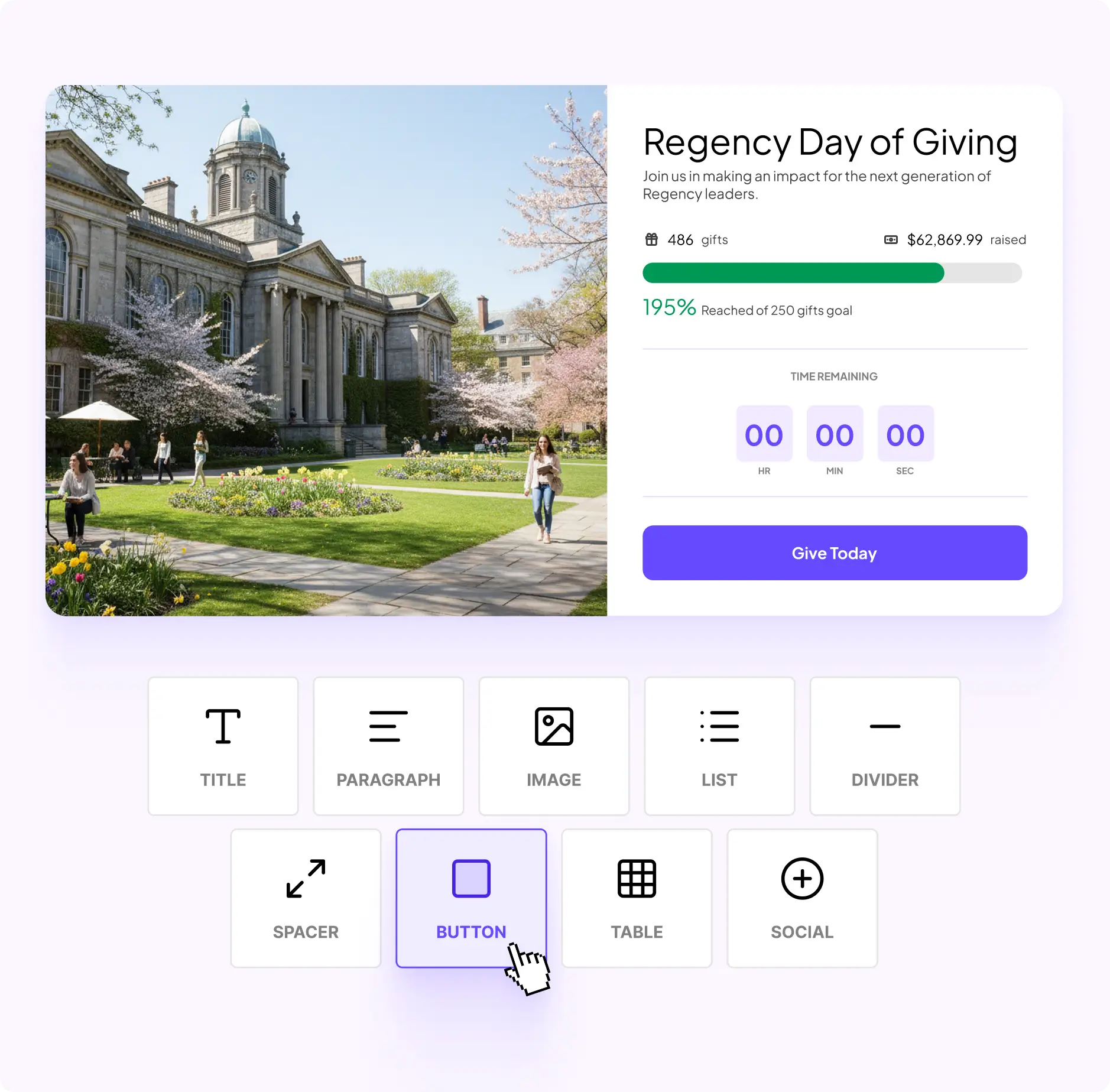 Launch fully-branded giving pages and campaign hubs using a no-code builder that respects your institution's identity.
