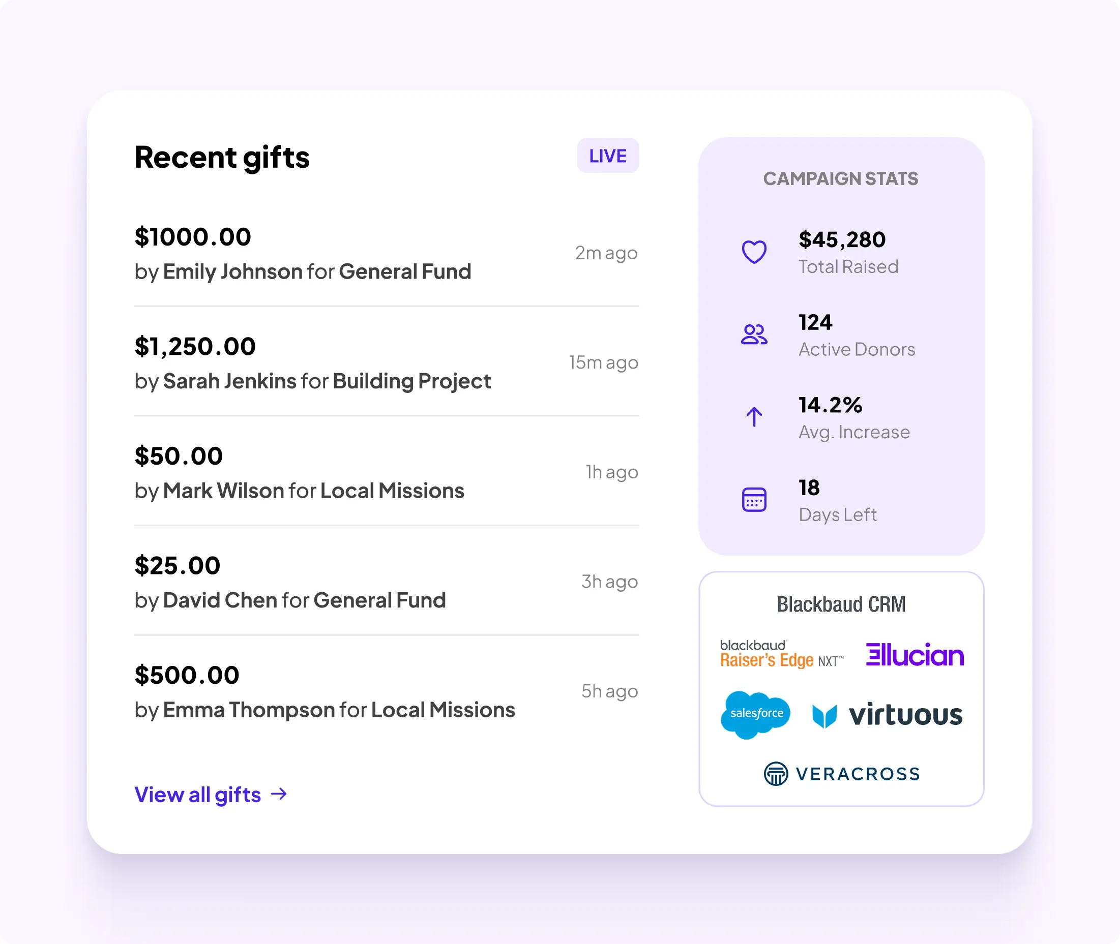 The flexible, easy-to-run giving platform that helps you raise more, reach further, and sync every gift back to your CRM with complete control.