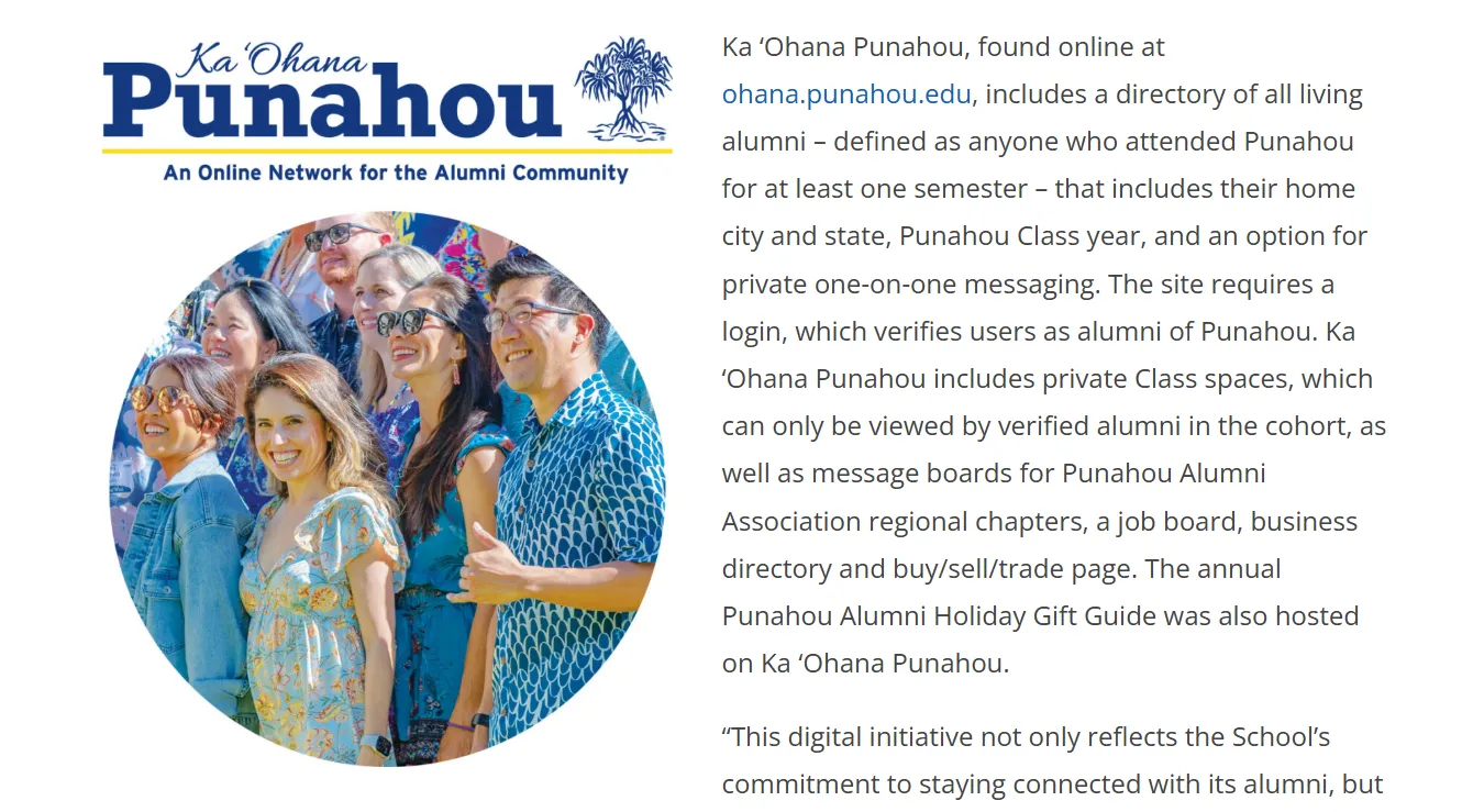 Punahou School in Hawaii created an integrated digital alumni platform called Ka ‘Ohana Punahou that goes beyond email newsletters. The portal includes an alumni directory, private class spaces, message boards for regional chapters, job boards, business listings, and more. Since its launch, about 7,000 alumni visit the platform monthly and roughly 70% of contactable alumni have engaged with it. This is a community hub that keeps alumni connected and interacting year-round.