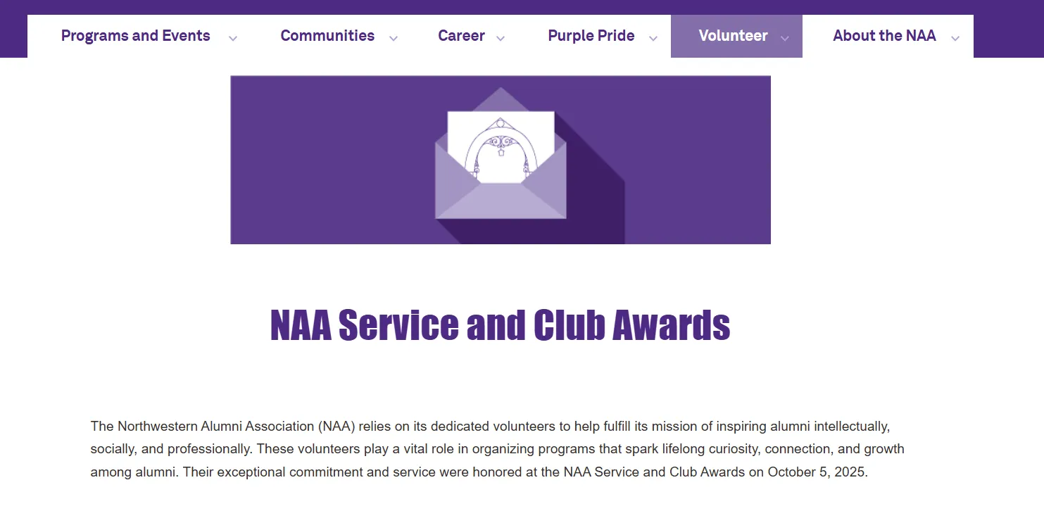 Northwestern University’s Alumni Association offers a variety of awards recognizing alumni achievements from career success to volunteer leadership and community involvement. These awards celebrate clubs, individuals, and volunteer contributions, making recognition a central driver of engagement and community pride.