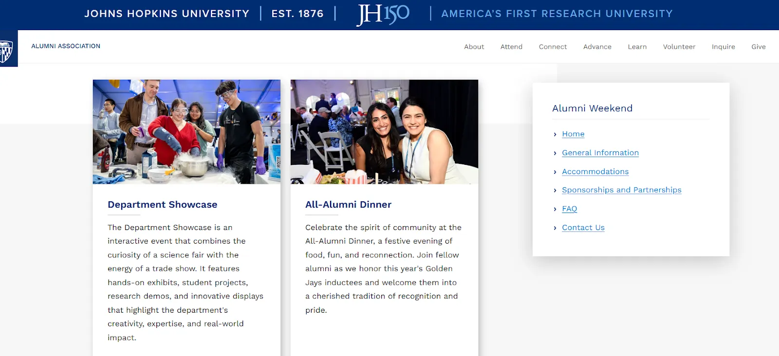 Johns Hopkins hosts an annual Alumni Weekend that goes far beyond a simple reunion. The multi‑day program includes signature events like interactive department showcases, alumni dinners, a traditional Crab Cake Lunch, social mixers, and even big‑game tailgates. It’s designed to appeal to diverse alumni interests from intellectual curiosity to social celebration, and draws alumni back to campus not just once, but year after year.