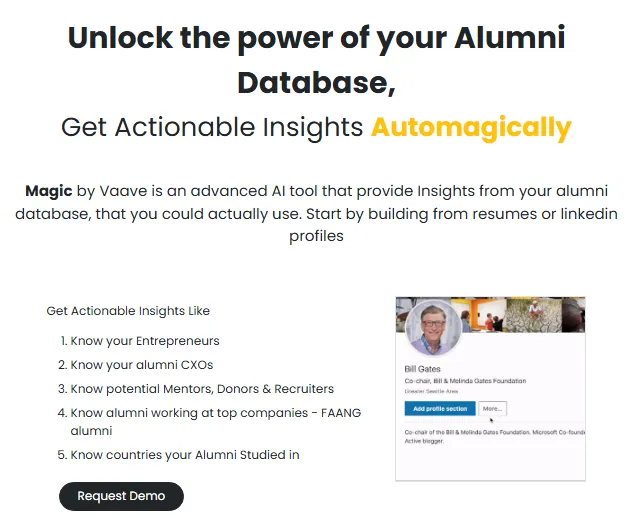 Vaave's answer was "Vaave Magic," an AI-powered engine that can build complete alumni profiles from LinkedIn URLs or resumes. This approach assumes institutions need help constructing their database, not just synchronizing it.